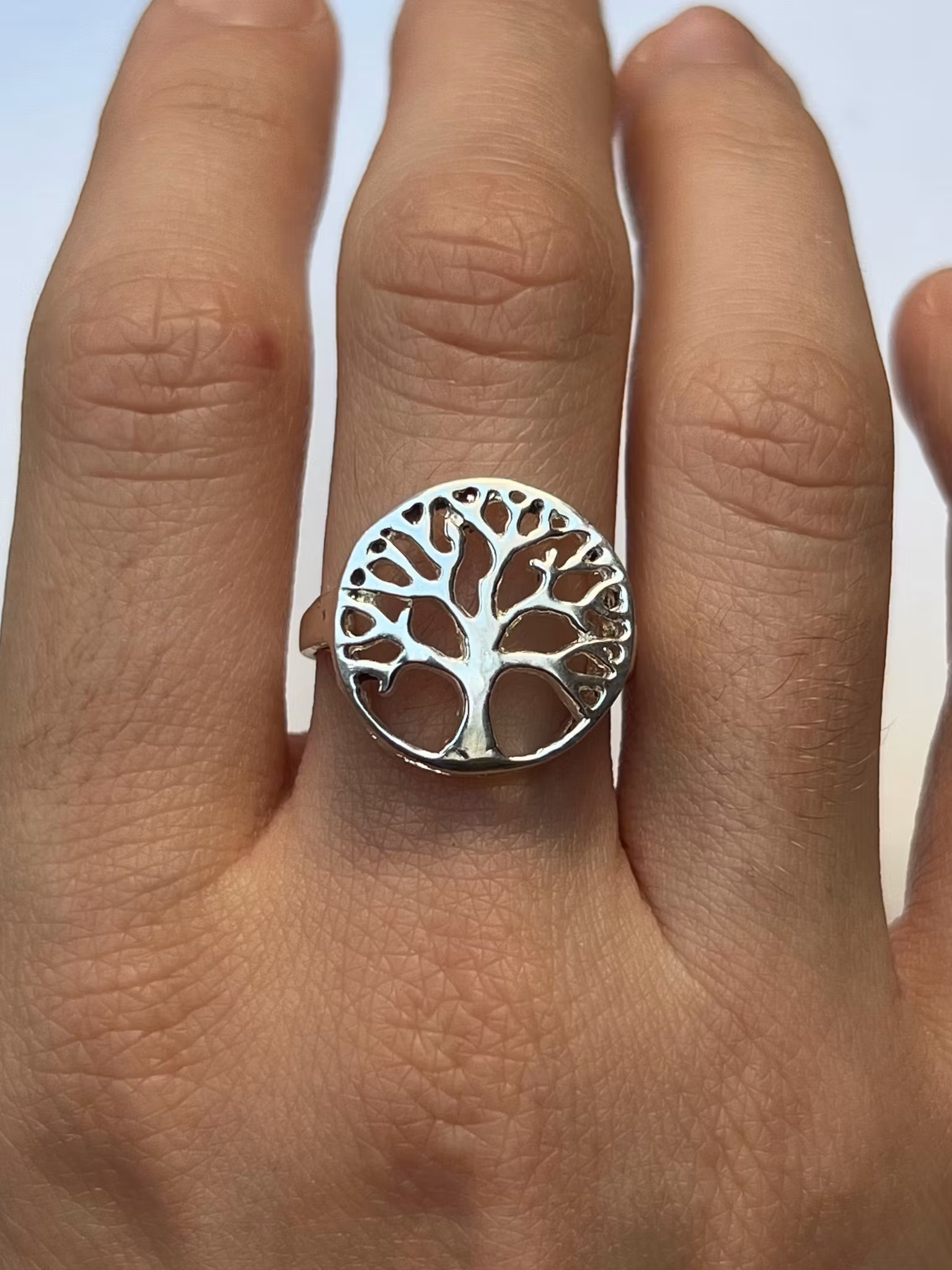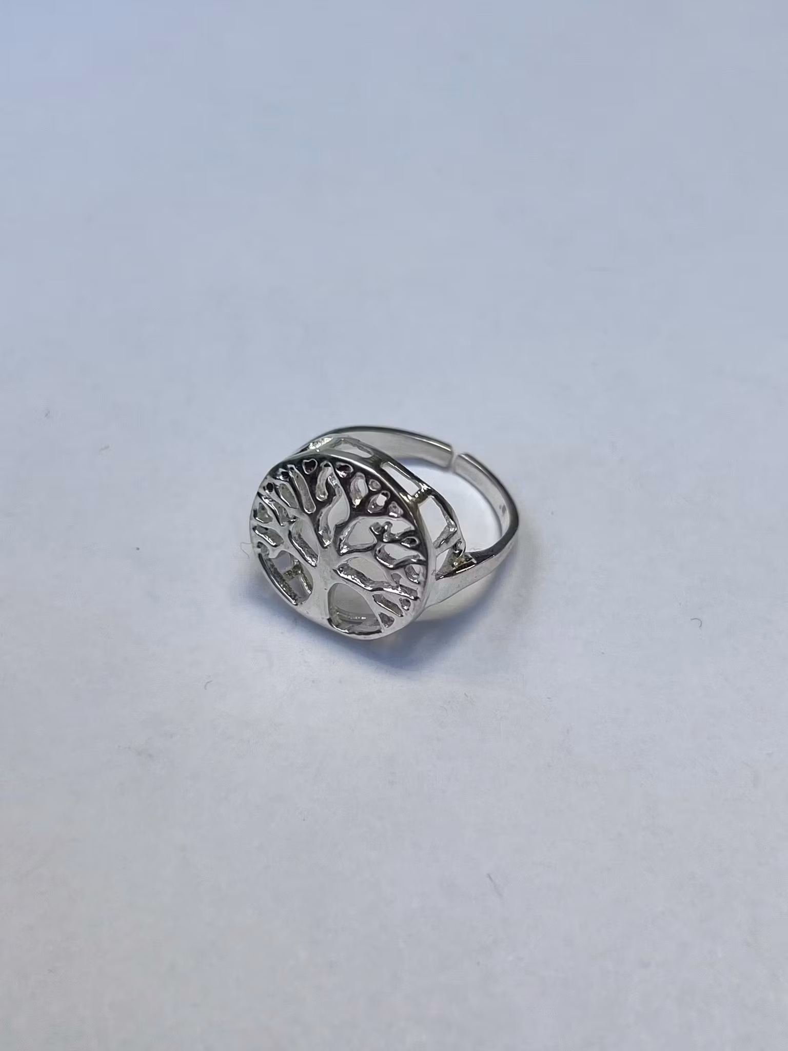 Tree of life ring i försilvrad mässing. Ringen är ställbar men kommer trots det i olika storlekar. Välj din storlek i rullmenyn ovan.