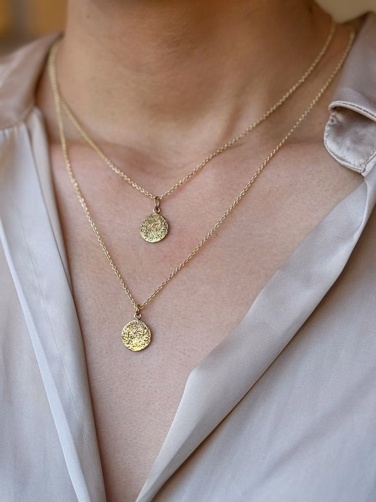 Detta halsband kommer på en tunn halskedja i mässing. Ovan i rullmenyn väljer du vilken längd du önskar på kedjan, kort (46 cm ) eller lång (56 cm). Modellen på bilden bär den långa versionen. Halsbandet med fyrkanten motsvarar den korta längden. Hon har en relativt tunn hals och tänk på att var hänget hamnar varierar beroende på din hals.