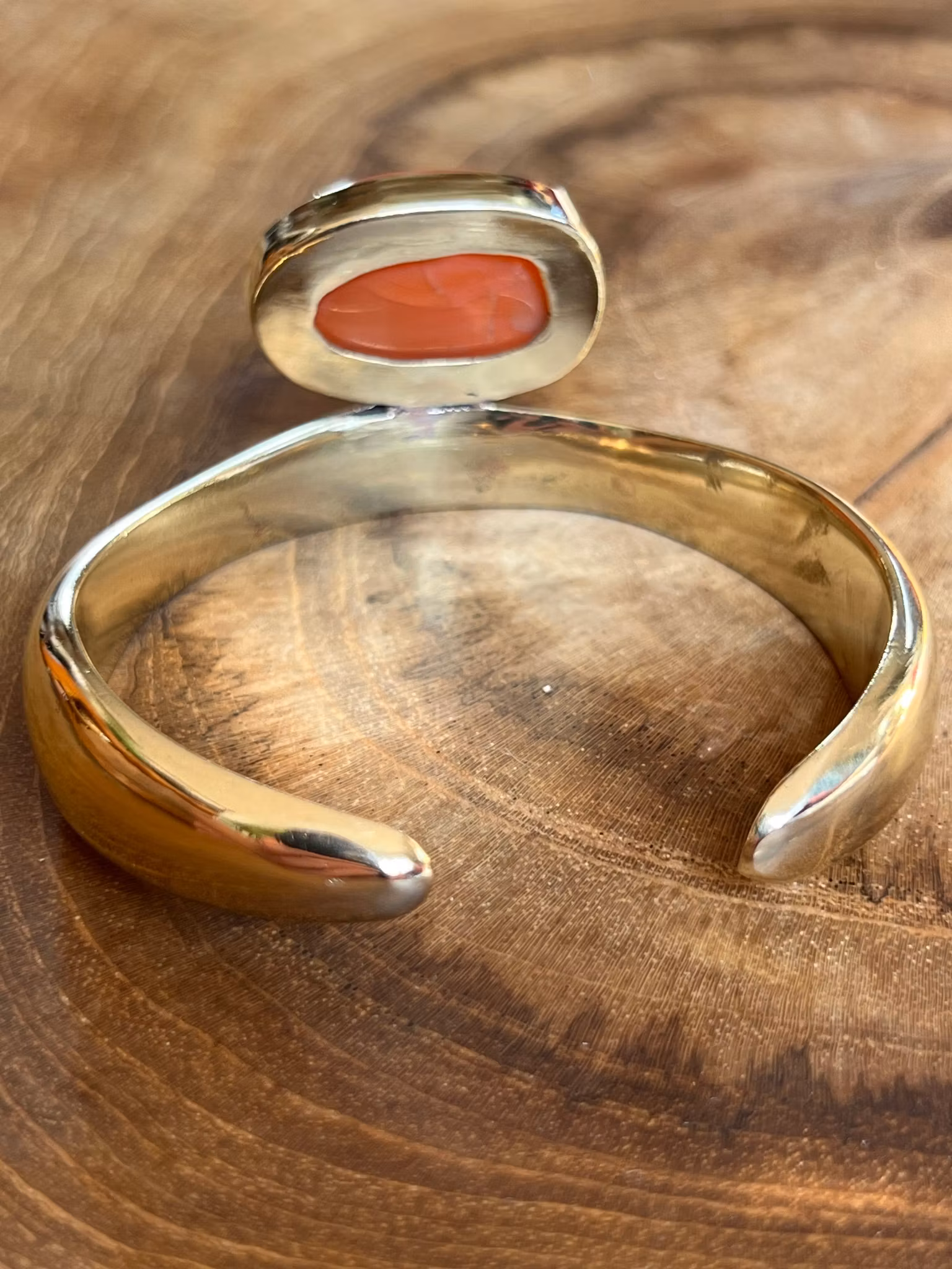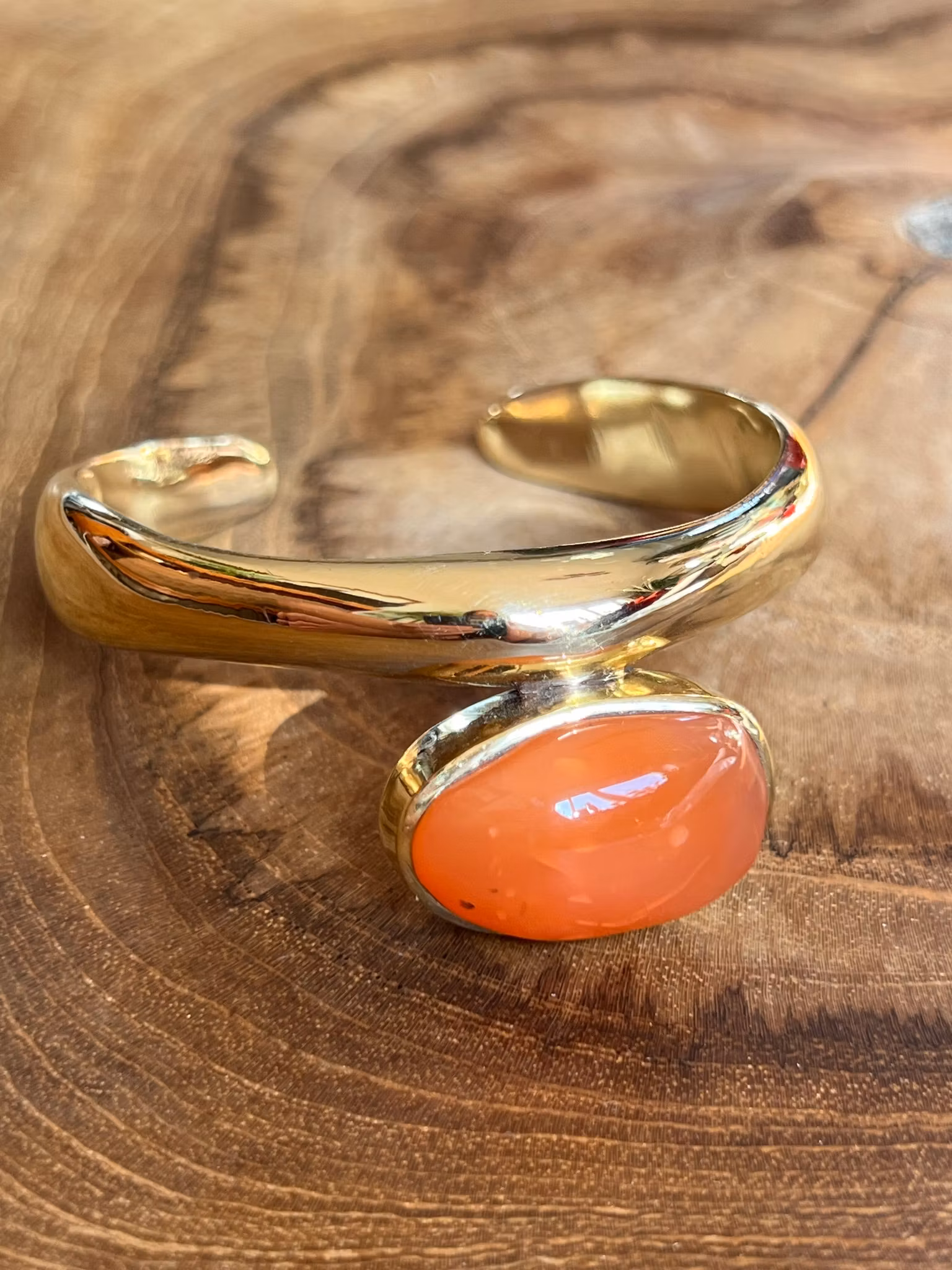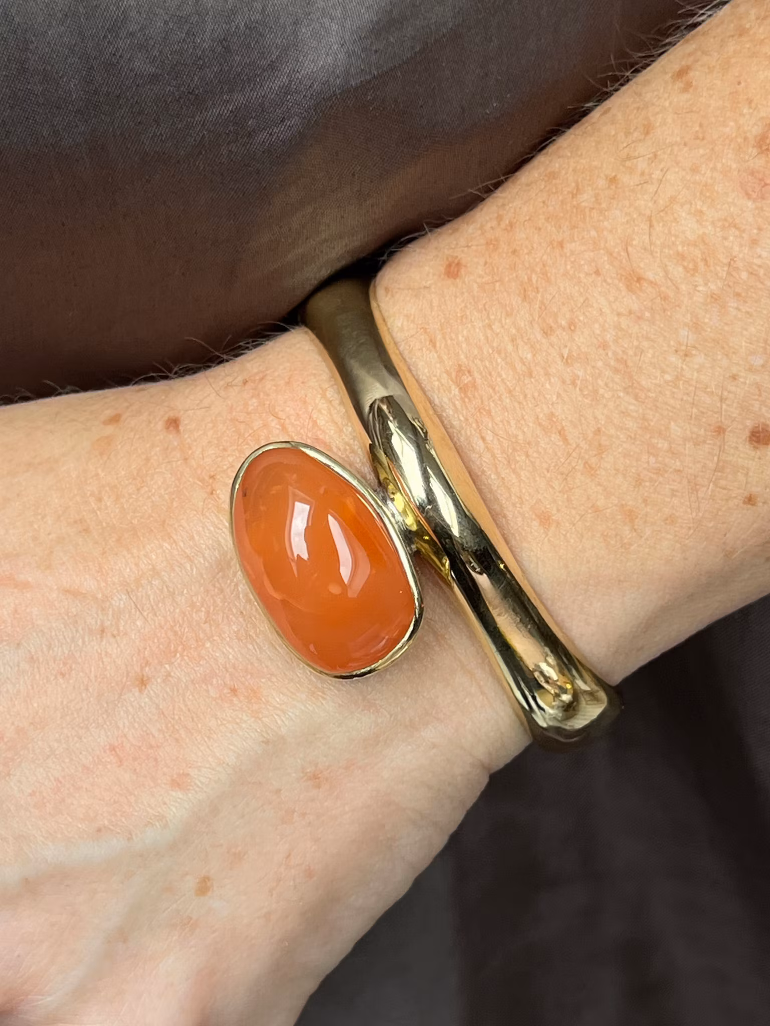 Detta stenarmband är ett riktig statement piece. Den unika stenen står i centrum, med ett uttryck som känns både kraftfullt och naturligt. De varma orangea tonerna i Karneolen väcker doftminnen av apelsinblomma och varm sommarbris. Bjud in mer färg och värme med denna vackra sten.