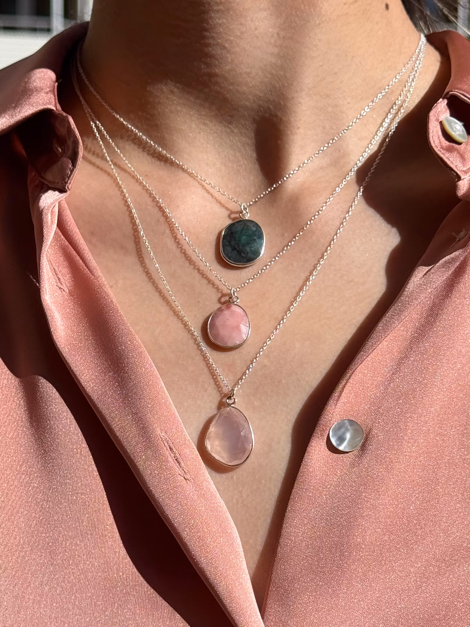 Detta halsband kommer på en tunn halskedja i 925 silver. Ovan i rullmenyn väljer du vilken längd du önskar på kedjan, kort (40 cm) eller lång (51 cm). Se modellbild 2 för längdskillnader. Kedjan har dessutom en extra ring så att du kan även välja längd 45 på båda länderna. Modellen på bilden har en relativt tunn hals så tänk på att var hänget hamnar varierar beroende på din hals.