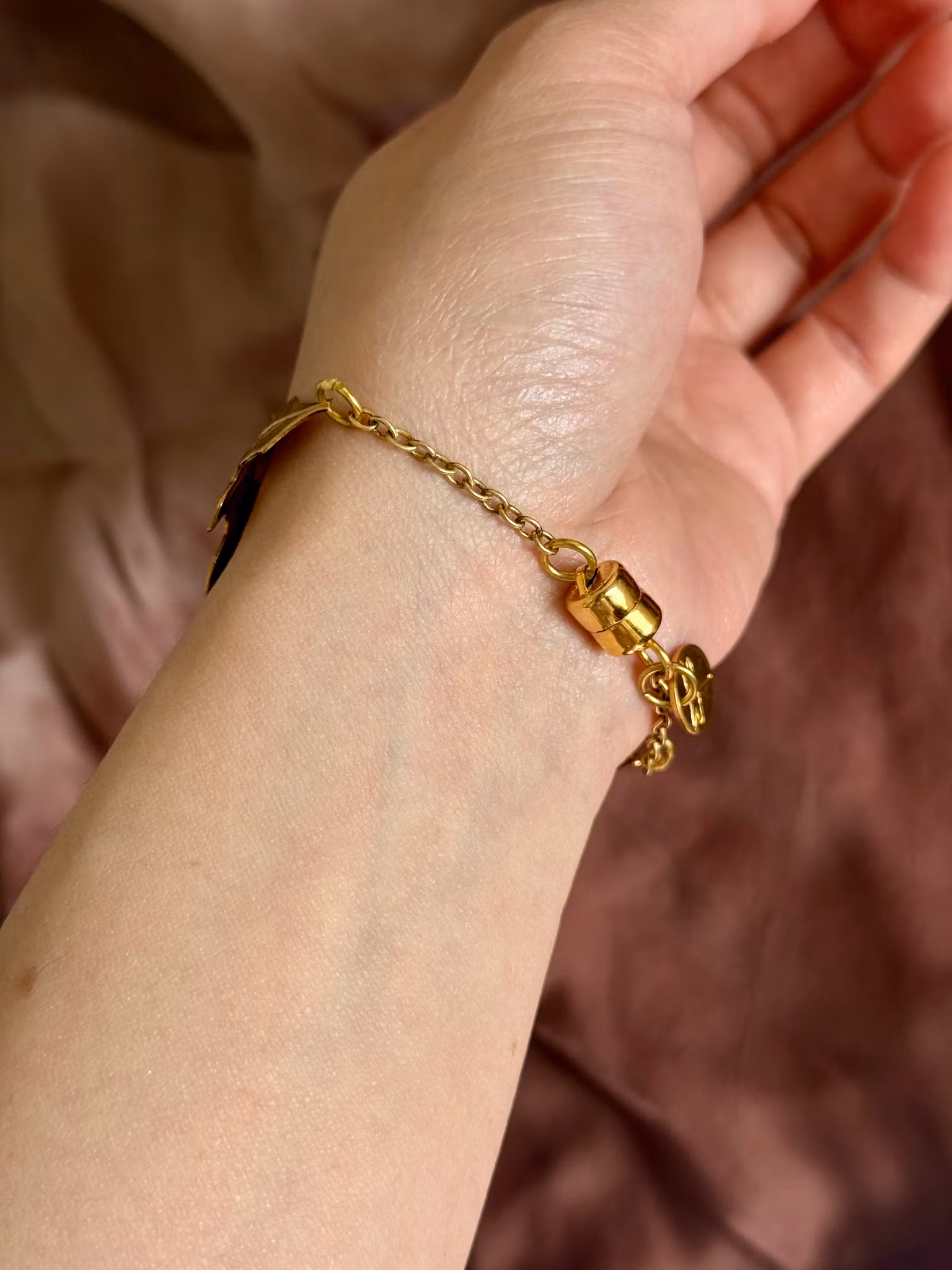 Detta armband består av ett hänge och kedja i förgylld mässing. Låset är ett starkt magnetlås som gör det enkelt att ta på och av det på sig själv. Du drar bara i en av kedjorna så öppnar det sig. Du väljer mellan tre storlekar S, M eller L.